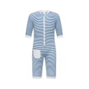 It has 3/4 length legs and arms with a soft cuff on both. It has a collar for protection. Made from beautiful blue and white striped fabric made from polyester/pbt. This premium fabric provides chlorine resistance, excellent shape retention and durability. It is very soft and quick drying.