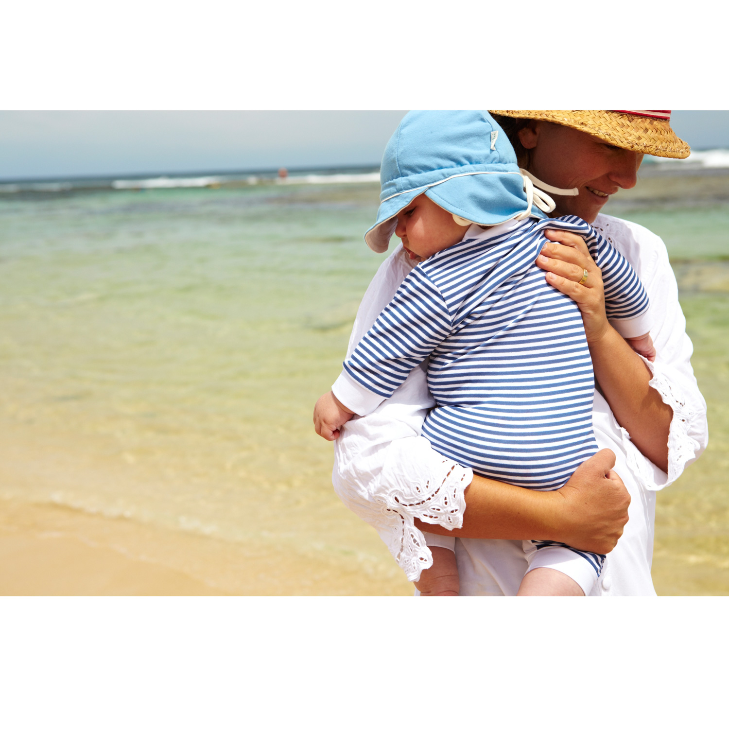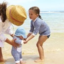 All in one zip-up rashie swimsuit ( UV Suit) . These suits are fantastic for giving a lot of protection to babies and toddlers. It allows exploring, crawling babies and adventurous toddlers to move around freely while still being protected for harmful UV rays.