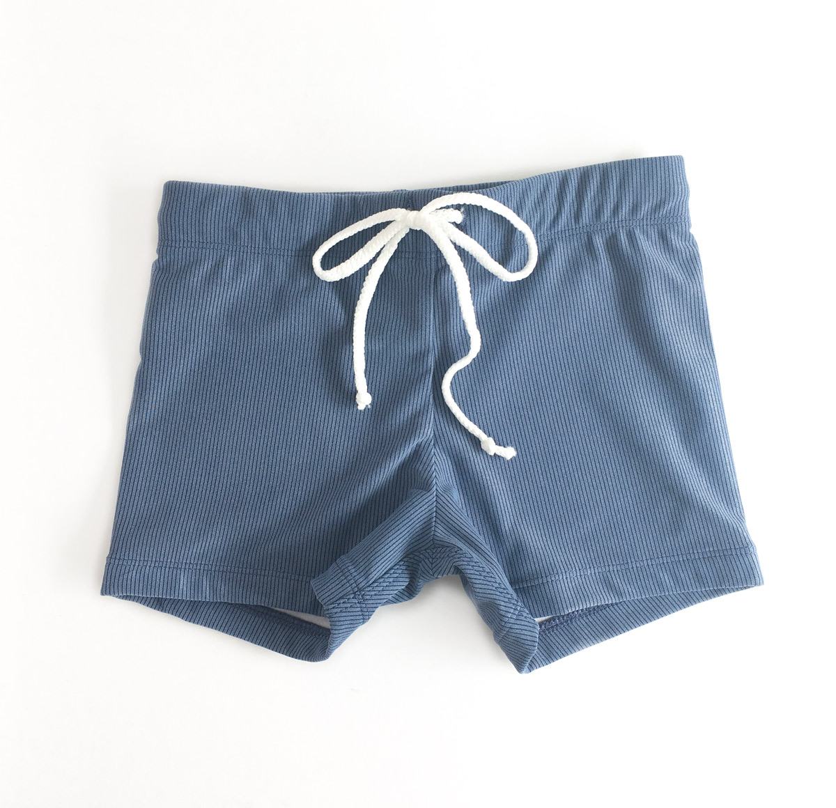 Great looking and super practical swimming trunks in beautiful textured blue marle fabric. These shorts are awesome. They are a cute little Euro style fit which makes them great for swimming lessons and the beach! They have a corded elastic waist, which means you can make them fit perfect.