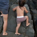 Great looking and super practical swimming trunks in beautiful textured grey marle fabric. These shorts are awesome. They are a cute little Euro style fit which makes them great for swimming lessons and the beach! They have a corded elastic waist, which means you can make them fit perfect.