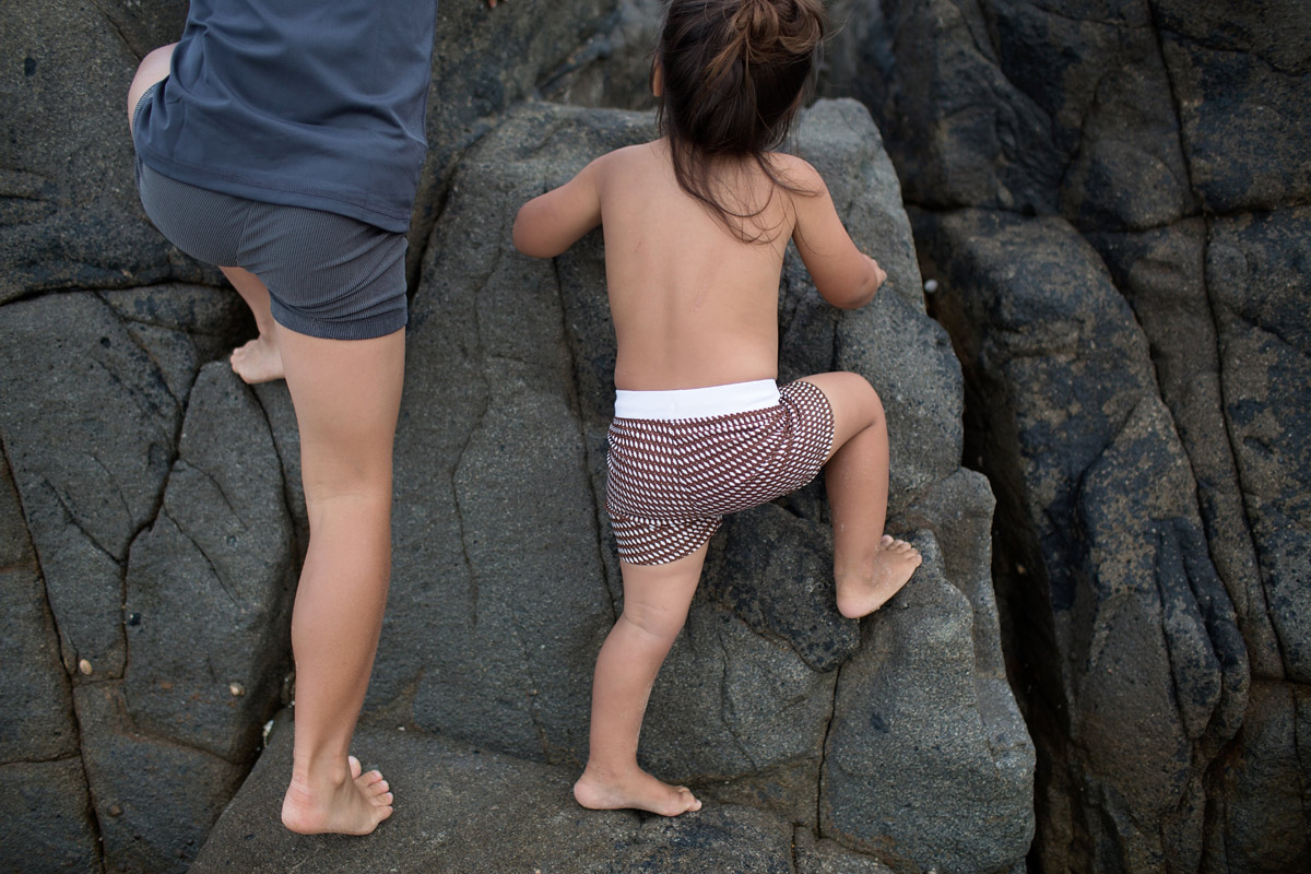 This fabric is soft, quick drying and chlorine proof – so they wont turn into saggy bathers that fall off.