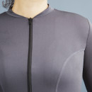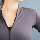 Women’s long -sleeved sun protection swimming top (Rashie) in grey. Zip up the centre front so it is easy to get on and off, this also allows you to completely protect your chest or have it open. The long sleeve length offers fantastic protection. The detail in the seams offers a flattering design, drawing the eye to the waist. The length is just to the hips, long enough to cover your lower back whilst doing activities such as kayaking.